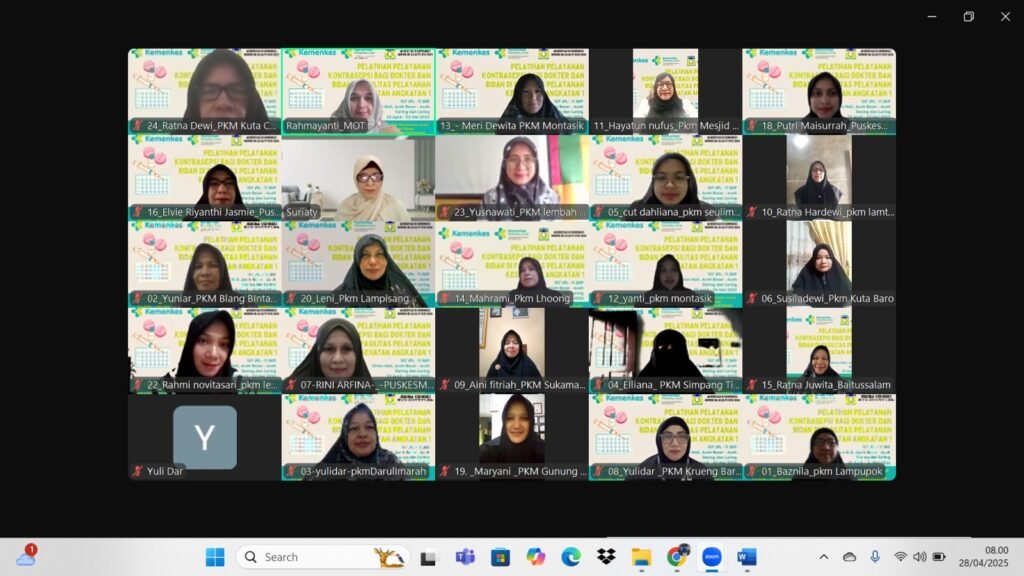 Banda Aceh — Unit Pengembangan Kompetensi SDM Kesehatan Aceh sukses menyelenggarakan Pelatihan Pelayanan Kontrasepsi bagi Dokter dan Bidan di Fasilitas Pelayanan Kesehatan pada 22 April–2 Mei 2025. Kegiatan ini dilaksanakan secara hibrid, memadukan pembelajaran daring melalui Zoom dan tatap muka di Hotel Seventeen, Banda Aceh.