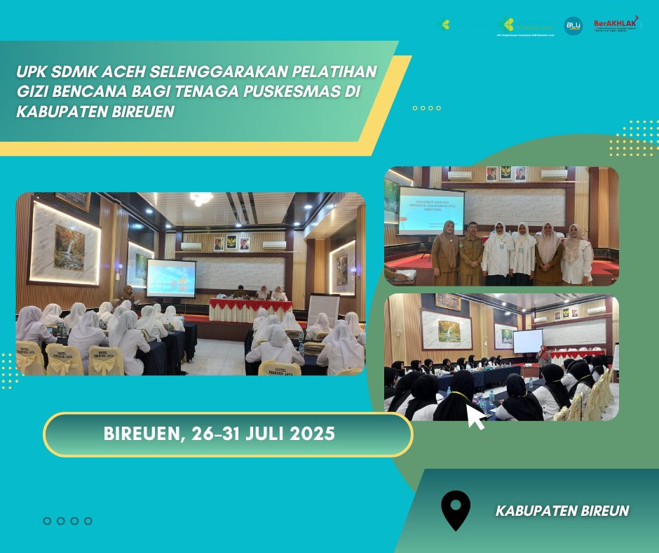 Bireuen, 26–31 Juli 2025 — Unit Pengembangan Kompetensi Sumber Daya Manusia Kesehatan Aceh (UPK SDMK Aceh) bersama Dinas Kesehatan Kabupaten Bireuen sukses melaksanakan Pelatihan Gizi Bencana bagi tenaga kesehatan puskesmas se-Kabupaten Bireuen. Pelatihan yang berlangsung selama enam hari ini bertujuan Read More …