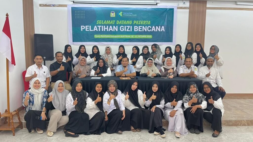 Aceh Besar, 28–31 Oktober 2025 – Dinas Kesehatan Kabupaten Aceh Besar bekerja sama dengan Unit Pengembangan Kompetensi Sumber Daya Manusia Kesehatan Aceh (UPK SDMK Aceh) menyelenggarakan kegiatan Pelatihan Gizi Bencana yang berlangsung di Hotel Orion, Aceh Besar.