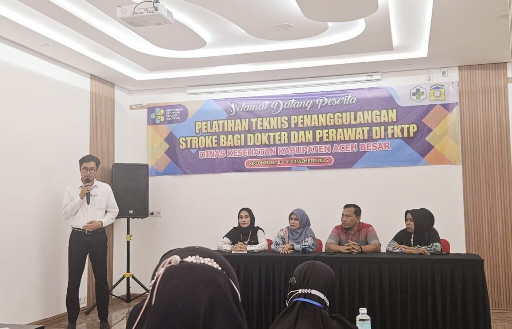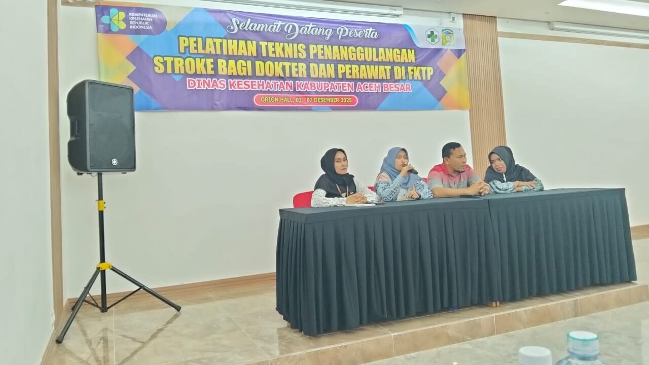 Aceh Besar – Di tengah meningkatnya prevalensi stroke di Indonesia, UPK SDM Kesehatan Aceh bersama Dinas Kesehatan Kabupaten Aceh Besar mengambil langkah strategis melalui penyelenggaraan Pelatihan Teknis Penanggulangan Stroke di Fasilitas Kesehatan Tingkat Pertama (FKTP). Kegiatan berlangsung selama lima hari, mulai 3–7 Desember 2025, berlokasi di Hotel Orion Hall, Aceh Besar, dengan peserta tenaga kesehatan terpilih dari berbagai FKTP yang sebelumnya telah menerima undangan resmi.
